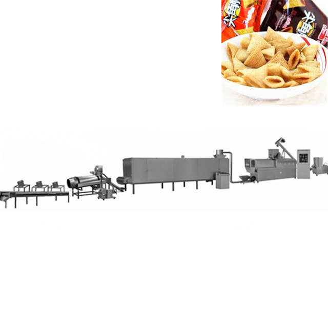 Mixer→Screw Conveyor→Extruder→Cutter→Hoister→Fryer→Deoilling Machine→Hoister→Flavoring Drum→Cooling Conveyor→Hoister→Packing Machine