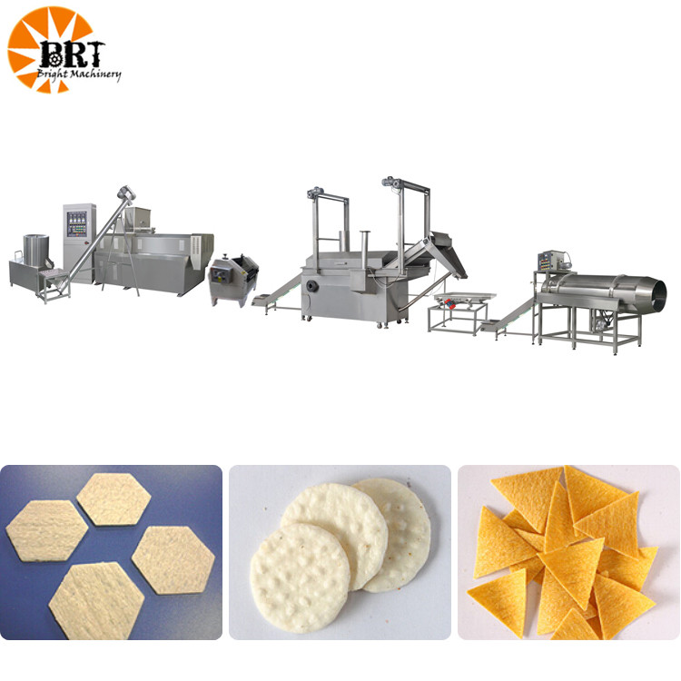 The Nachos/Doritos/Tortilla production line is made of corn flour after extrusion, molding and frying. Its main ingredients are corn meal, water, vegetable oil and salt. After frying, spray on the surface with a variety of flavoring powder. Because of its crisp and delicious, it is loved by children and adults.The production line is equipped with world-renowned electrical parts and frequency converters, which are safe and reliable